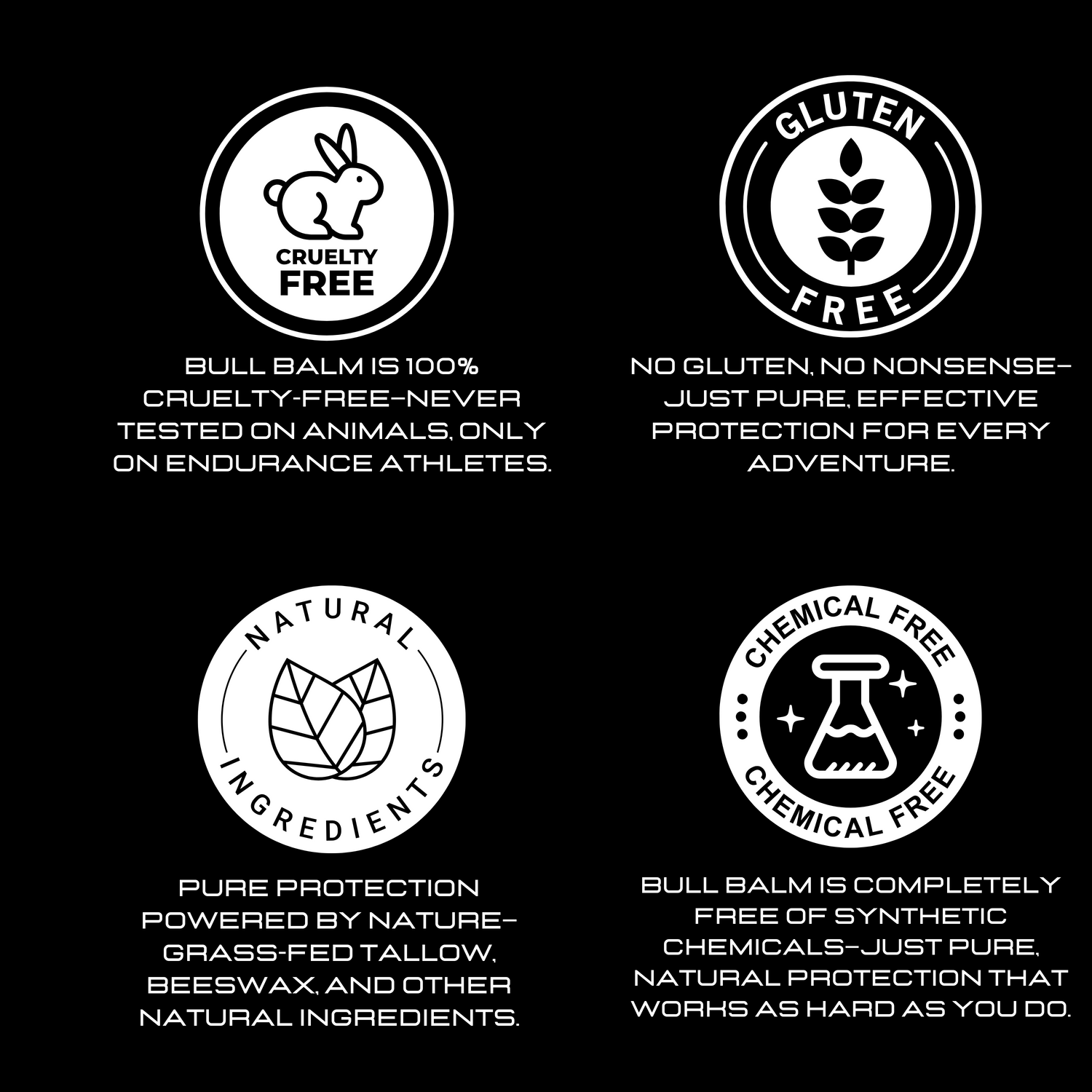 Forged for the fearless—Bull Balm Anti-Chafing Cream is built for the tough. Made with pure grass-fed beef tallow, lanolin, beeswax, and plant oils, it creates a hardcore barrier that fights friction, sweat, and irritation. No cheap fillers, only natural ingredients — just a raw, powerful shield that keeps your skin strong mile after mile. Whether you're crushing marathons, trails, or the grind of everyday life, Bull Balm has your back with all the protection, and none of the shit.